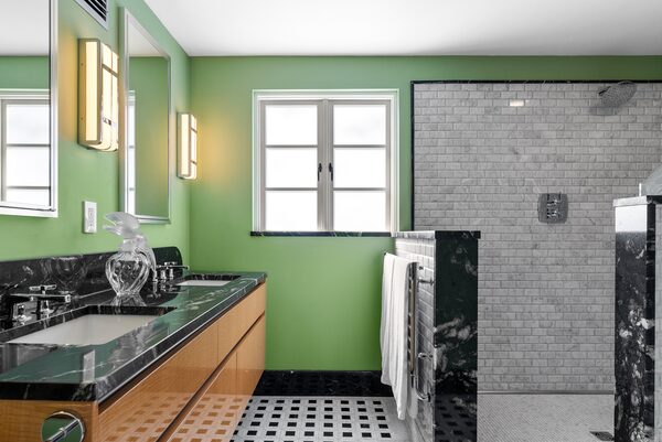 “We’re not nuts enough to do a perfect historical restoration; we took some liberties,” Mr. Holzheu said. “When we think of 1930s, everything is taupe and black and white; the original exterior was pale green with dark green windows. The walls in the kitchens and bathrooms were canary yellow and the cabinets were blood red.”