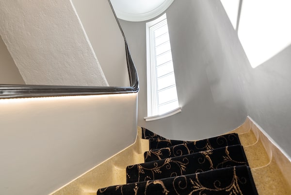 The curving staircase is finished in sand-coloured terrazo.Andre McKenzie/Andre McKenzie/SilverHouse