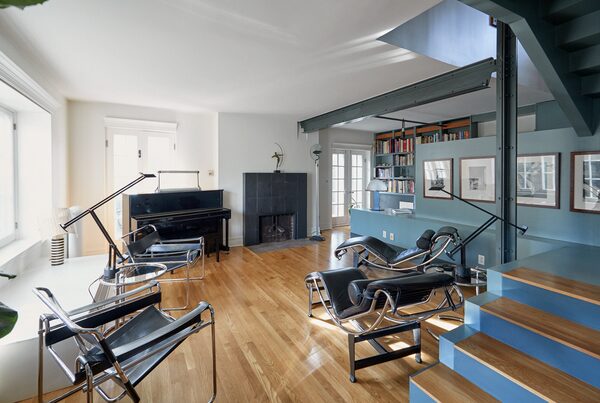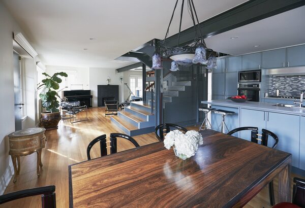 In the centre, a staircase of wood and steel serves as a room divider and sculpture. Cabinets built into and around the staircase create hidden storage and provide display areas for the couple’s art collection.