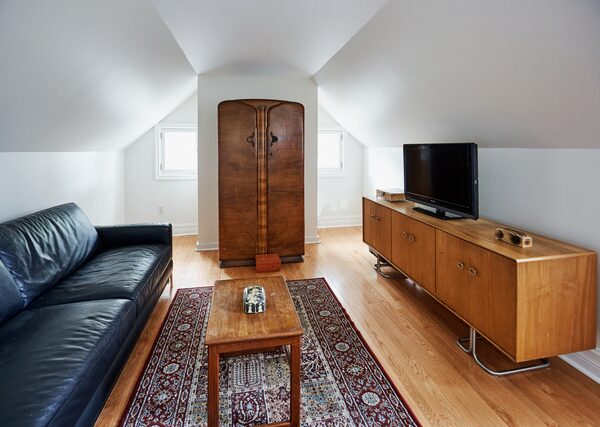 On the third floor, two additional bedrooms provided a retreat for the couple’s daughter when she was growing up. One of those was her former playroom; now, it serves as a family space for lounging and watching television.