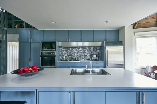 The steely-blue cabinets hide some of the home's mundane elements.Per Kristiansen/Per Kristiansen