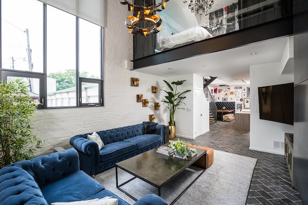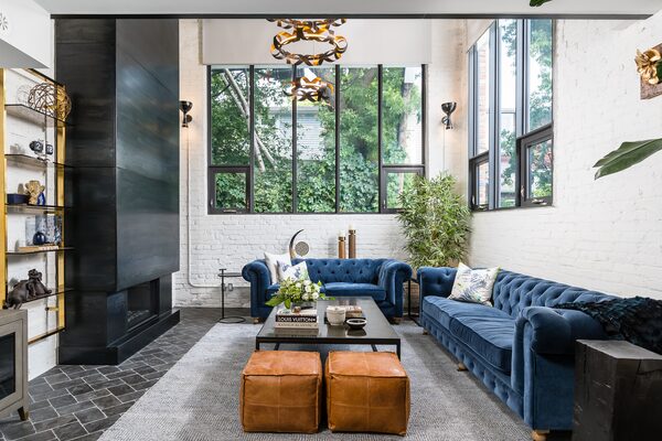 The living room takes advantage of the two-storey interior space and being the corner house of the 16-unit development, which means there are soaring windows are on two walls. The fireplace has a black, cold-rolled steel cladding the entire height of the room, some gold and glass shelves, bronzed flower sculpture plaques and plush blue velvet couches soften the industrial feel. And don’t worry about finding furniture to match this design; when they move, Wade and Melissa plan to take basically just their clothes and their toothbrushes: “We would leave everything here. Everything was bought for this space.”