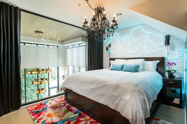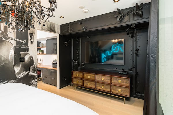 Overlooking the living room is a master bedroom loft, but with a glass wall separating the spaces. Black curtains frame the windows and a black wall conceals a 60-inch television, surrounded by custom-made plaster floral and wasp sculptures. Facing the glass wall is a custom-made wallpaper mural of Vespa scooters (vespa means wasp in Italian), inspired by the couple’s own two-wheeled hobby rides. There’s a curving neon-tubing-style LED light fixture on the wall and another antique chandelier (with blue-glass pendants)