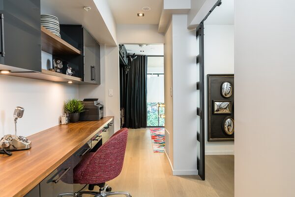 Of course, it is a modern condo so the units are metered separately and heat, water and electricity are not included in the almost $800 a month maintenance fees. There’s also not much in the way of common elements other than the parking stacker in the garage (an elevator that stores the resident’s cars below ground).