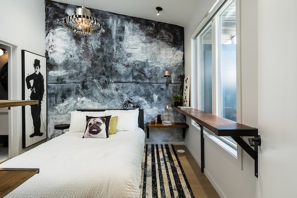 An original mural serves as the headboard in the third-floor second bedroom.Birdhouse Media