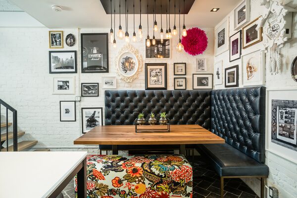 “We didn’t want a dining table, we want a banquet corner,” Mr. Grocott said. “We want it to look like that booth everybody hopes they get in a restaurant.” They hired TEB Interiors and lead designer Terry Briceland to realize their booth and the result is a black leather cushion bolted to a painted white brick wall, surrounded by a flurry of black and white photos in eclectic framing types, a working cuckoo clock and industrial-ish light fixtures with several hanging bare bulbs all in different sizes and shapes. Set against the herringbone slate floor tile, it does look like a hip Bloor Street restaurant.