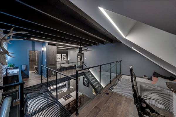 Smart home technology throughout the space lets Mr. Snider set the temperature or create a mood with strip lighting that runs along the edges of the staircase and room.