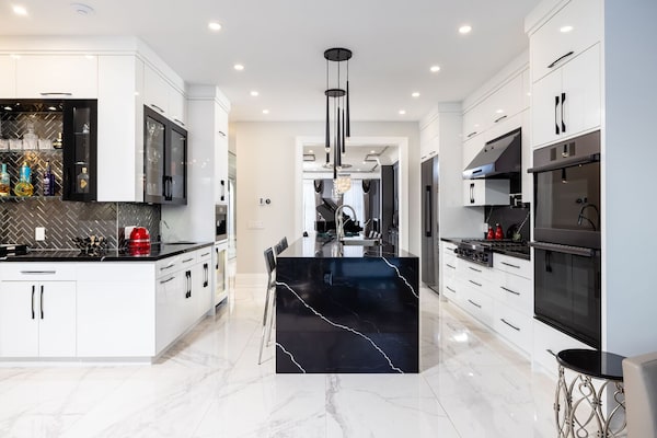 The dramatic centre island in the kitchen is clad in black stone with waterfall sides.Rob Holowka/Rob Holowka