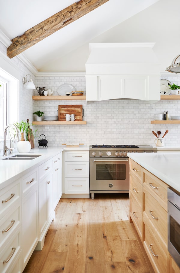 The kitchen features open shelving instead of full upper cabinets.Valerie Wilcox/Valerie Wilcox