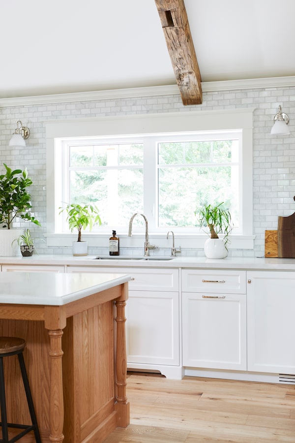 The kitchen was relocated to the centre of the house (the original layout was more bisected, with one half dedicated to an in-law suite) and now commands a central view of the rear yard. The kitchen has a few dedicated zones: the preparation area with the sink and stove features open shelving instead of full cabinet uppers on walls covered in white subway tile. A huge island sits in the middle of this space (with lathe-turned posts giving it just a little rustic charm) and mixed pantry/hutch/kitchen office is snugged in the half-wall between two entryways. A large pantry and fridge cabinet (there is another pantry off the kitchen that shares space with the laundry room on the way to the garage/workshop) separates this from the dining table and one of three of walkout doors to the rear deck and stone patio. More of those decorative beams line the ceiling in the kitchen and this space (decorative because the new roof is a truss, and these are not structural “exposed” beams).