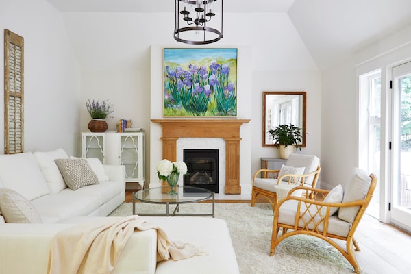 A second sitting room features an antique fireplace mantle and doors to the deck.Valerie Wilcox/Valerie Wilcox
