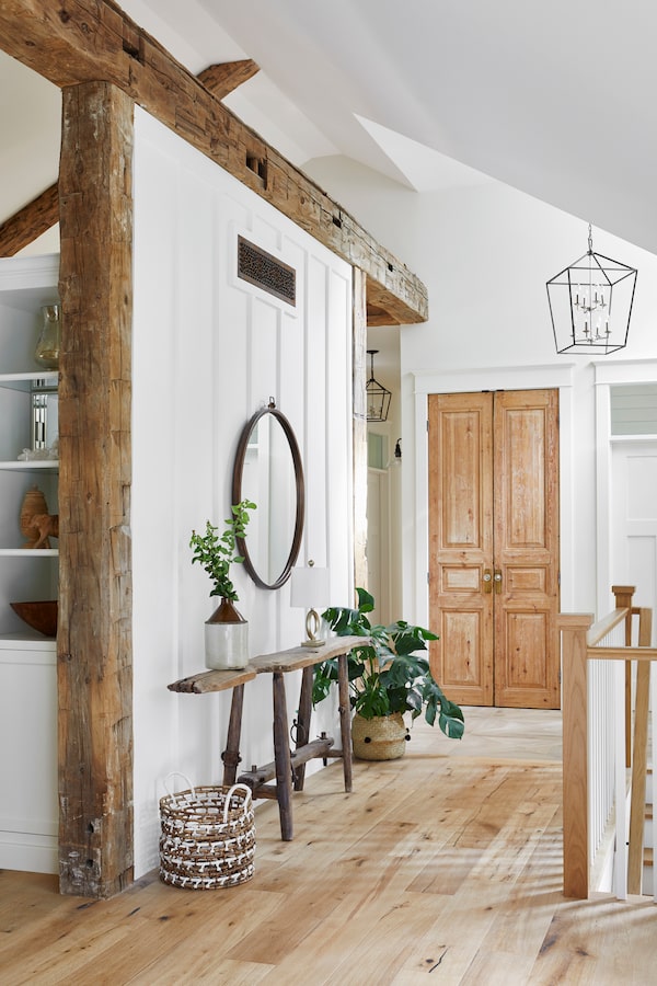 The front door is framed by narrow windows on all three sides. In addition to adding light there’s an architectural motive for those windows that becomes clear once you step inside. To the right of the front foyer is a powder room and a set of extra-tall antique doors (sourced from Egypt). In order for more standard doors to match those antiques, dormer windows were added in this space, and on the front it made sense to extend the frame. There’s a lot of antique wood in the house; there are weathered beams used as decoration on the entryway to the kitchen and elsewhere on ceilings.