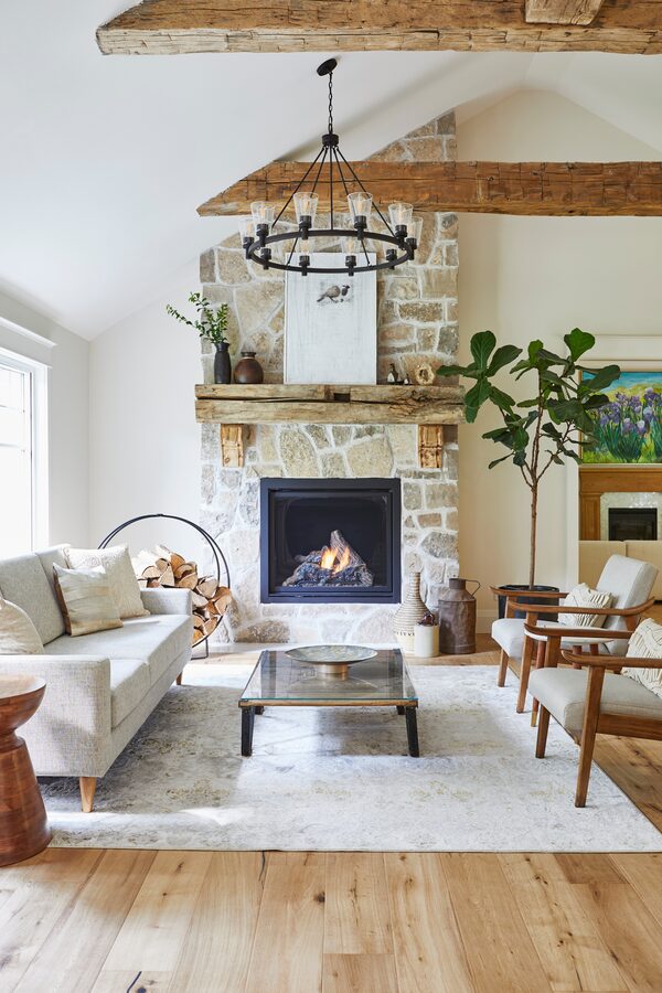 A main-floor sitting area is designed around this stone fireplace.Valerie Wilcox/Valerie Wilcox