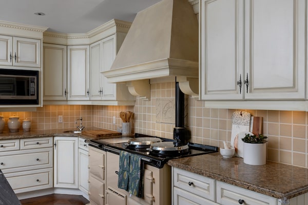 The kitchen has a deluxe Aga stove and breakfast nook that faces the street.Robert Holowka/Robert Holowka/Birdhouse Media