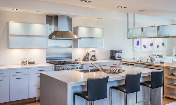 The modern kitchen has a large stone island with waterfall sides and a breakfast bar. The base cabinets provide extensive storage while frosted glass doors on the upper cabinets keep the appearance light.