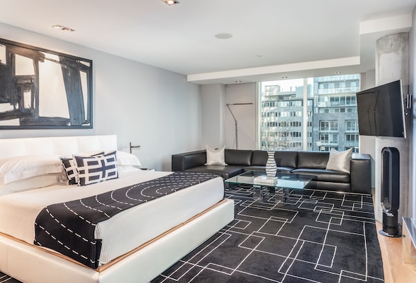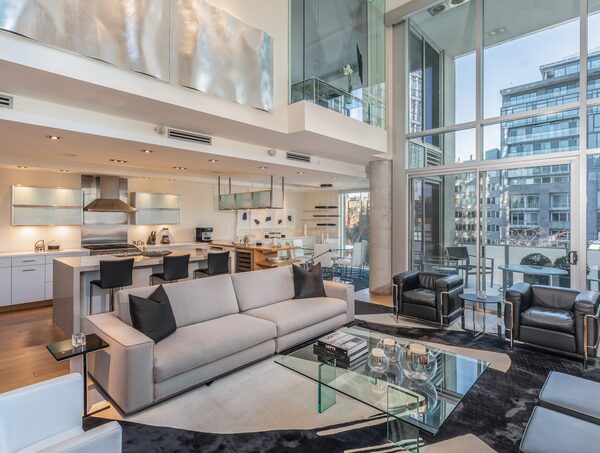The living area has a gas fireplace, expansive walls for an art collection, and a ceiling that soars to 18 feet high.
