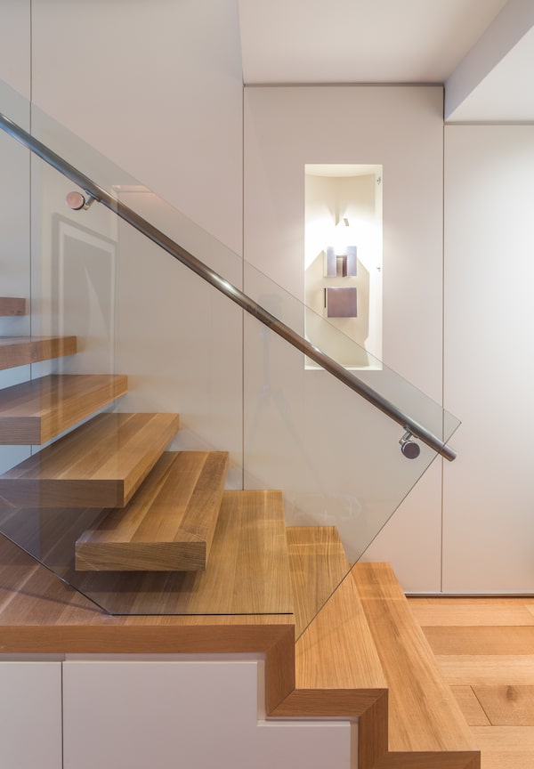 A floating staircase with glass rails leads to the upper level and its large master suite.