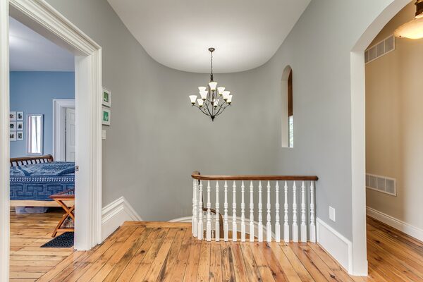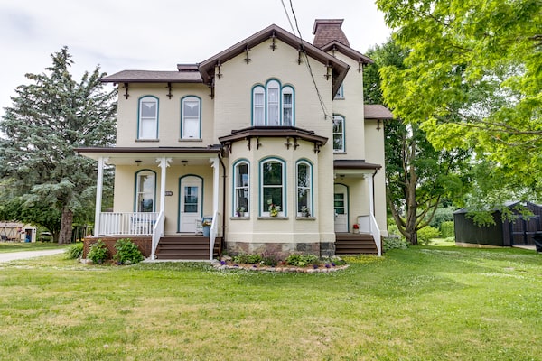 Purchased five years ago, the house at 14576 Old Simcoe Rd. originally caught the couple’s eyes with its grand details. Despite the ceilings being dropped multiple times, they said they could tell then how high the original ceiling heights were: 11 feet in the lower level and 10 feet in the upper level. Meanwhile, the second floor boasts pine flooring over 140 years old. There is also a curved wall staircase.
