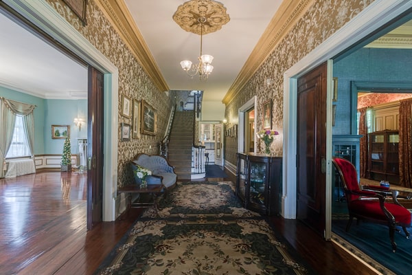 The Edwardian home was built in 1905, with architectural flourishes such as two-foot baseboard woodwork and porch columns tapered so their perspective looks proper from the street. Inside, the hallway walls are adorned with a gold-plated brocade pattern, and each bedroom had its own fireplace and sink.