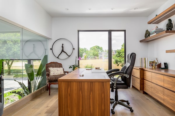 Mr. Henderson’s home office is perched between the two levels at the front of the house. A glass wall overlooking the living room brings light to the main floor.