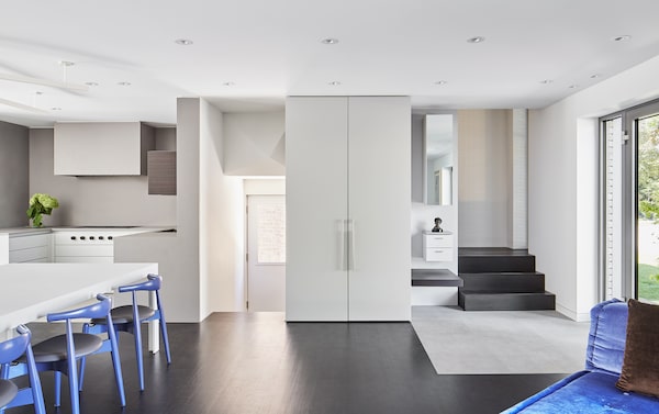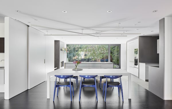 That level of detail, of course, carries inside. Step inside the cozy foyer and everything is precise, angular, logical. The colour palette is all warm greys, creamy whites, and a muted wood grain in the Bulthaup kitchen. Shelves float and walls slide to change room configurations. And absolutely nothing hinders the view of the lush, green backyard. The eye is surprised only by the aforementioned sofa and Hans Wegner dining chairs in a matching – and very striking – cobalt blue.