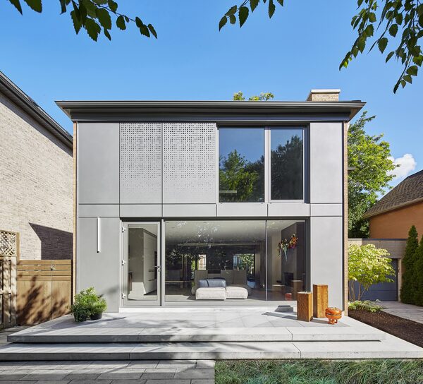 “It’s just organized chaos on a grid,” the architect says, flashing her big smile. After seeing how the panel beside the front door allowed daylight to enter the house and, at night, shine beacon-like, she came up with the name Veiled House. While the casual passerby may not notice, eagle-eyed architecture aficionados will note that the metal panels have been powder-coated to match the window frames.