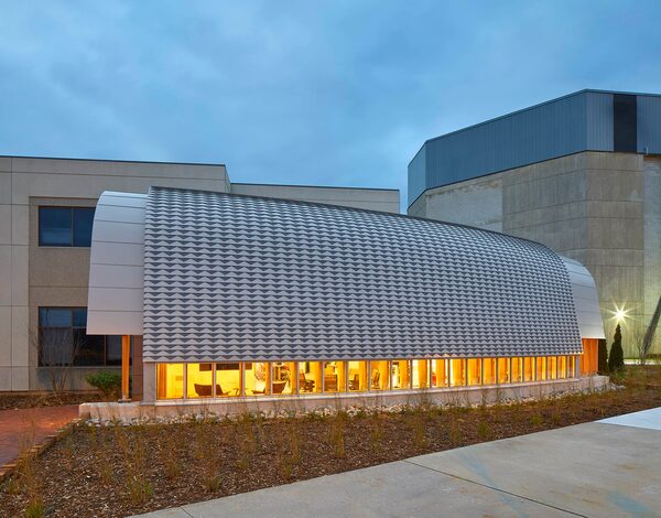The wooden ribs, he continues, number 28 to correspond with the moon cycle, and the general curved shape with doors on both ends references the longhouse, which the Seneca people and other Haudenosaunee built. The two-toned, triangular roof cladding has a dual meaning: it resembles reptilian scutes or scales, and it also calls to mind the Evergrowing Tree wampum (a sacred belt beaded with patterns that can be a visual memory keeper or used in treaties, and sometimes both).