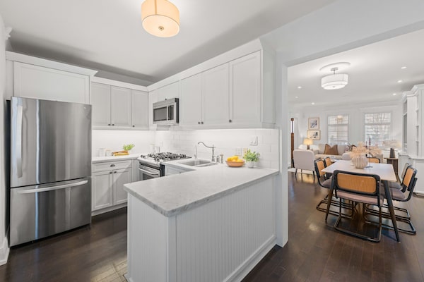 The kitchen has quartz countertops, newer stainless-steel appliances, and an exit to a deck and fenced-in yard.
