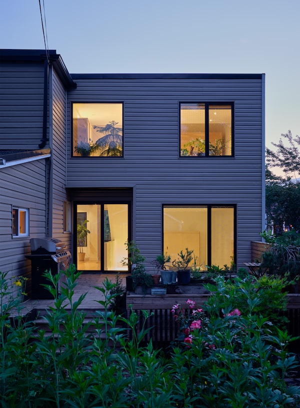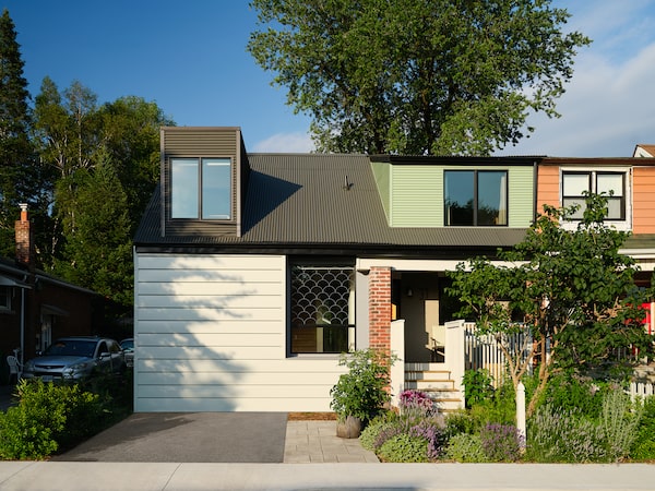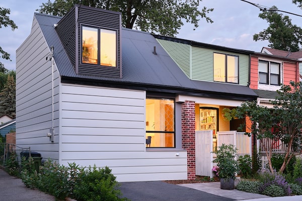 Although attached, from the street the addition reads like another semi-detached with its own dormer window and its own charcoal-grey and dove-grey siding; the original dormer was kitted out with mint-green siding. “You have all of these colourful houses. … It’s a wonderful collage,” says Ria Al-Ameen, an associate at Giaimo who worked on the project. “So we didn’t want to do just a white house, so we actually picked up colours from the [existing] context.”