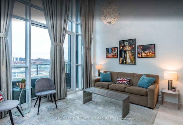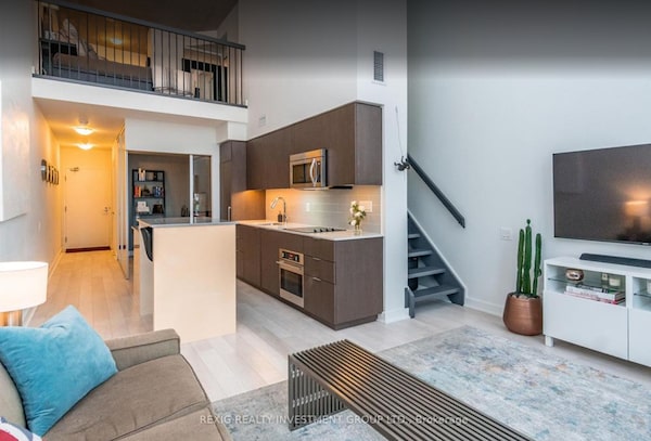 The two-storey, soft loft features 17-foot ceilings, floor-to-ceiling windows and a view of BMO Field.Rexig Realty Investment Group Ltd