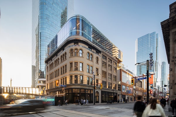 The extensive renovation of the Jamieson Building at the intersection of Queen and Yonge Streets, by Zeidler Architecture and ERA Architects, retained and restored the building's historic rounded corner.Adrien Williams/Adrien Williams
