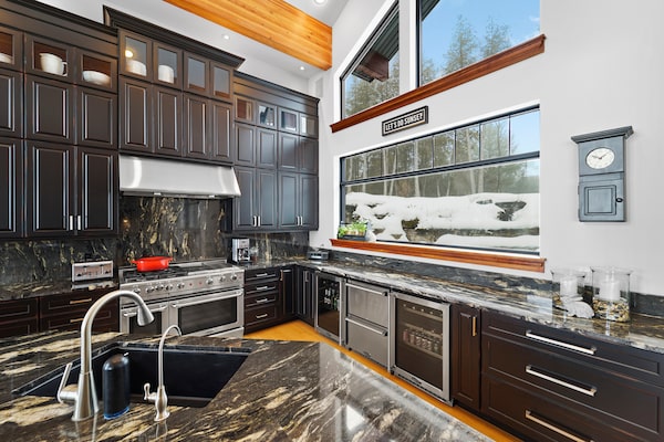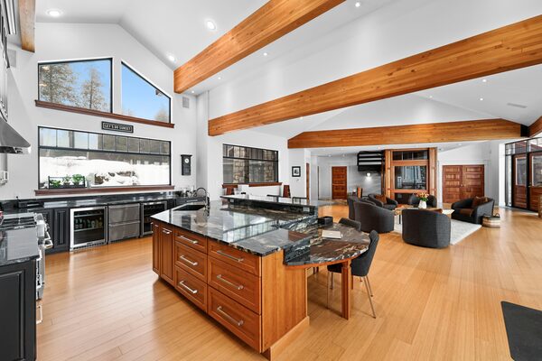 The first level has vaulted ceilings and exposed support beams with dormer-style windows. The kitchen, dining room and a massive living room occupy most of this level. The kitchen has a huge slab of tiger-striped granite on an island that has radiant heat beneath. The black cabinets are dark-stained cherry.
