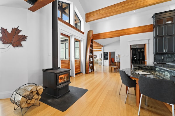 The living room faces a wall of windows separated by a railing.strata.ca
