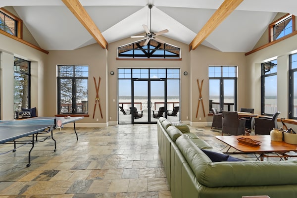 The living room faces a wall of windows separated by a railing. Looking over the railing, you realize the windows travel all the way to the ground floor in a curtain-wall of glass facing the lake that gives each level its own stellar vistas.