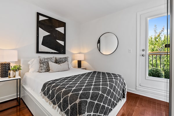 The larger suite has a den, dining area and kitchen on the main level, as well as a living room with massive patio doors.Hanton Real Estate Inc.