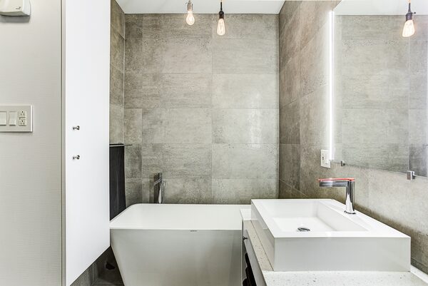 Opposite the bedrooms are two sliding doors that open to the laundry closet (stacked machines) and the bathroom. The standalone tub and graphic tiles in the walk-in shower offer a little decadence for the apartment’s sole bathroom. Around the corner is the interior building entrance and coat closet.
