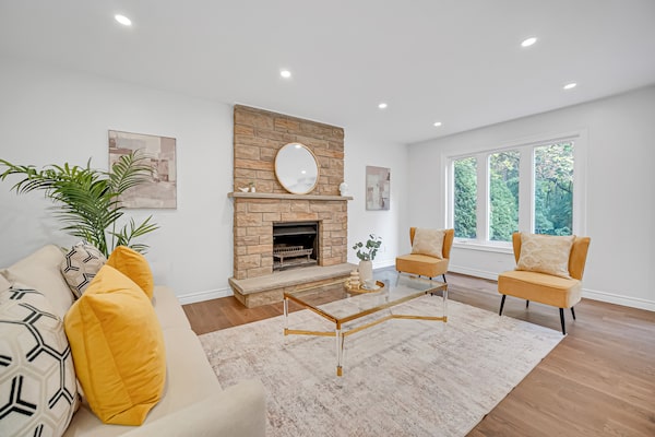On the main floor, there are two entertaining areas, including one with a fireplace.