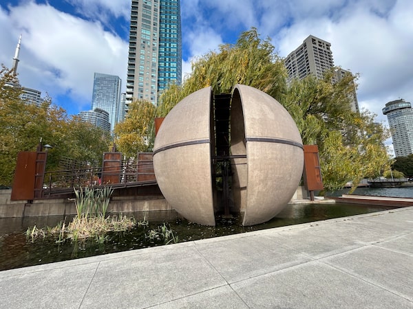 The big sphere in Harbour Square Park West holds stories.