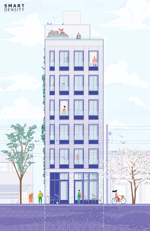A rendering of the "ten-plex" by architect and planner Naama Blonder, founder of Smart Density. She calls the concept a 'mini-mid-rise': basically, four- or five-storey buildings on small lots, with two apartments on each floor, all overlooking a small central courtyard, and served by a compact elevator.Smart Density