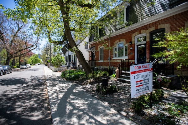 A for-sale sign stands outside a home on Sumach Street in Toronto's Cabbagetown neighbourhood on May 21, 2020.Fred Lum