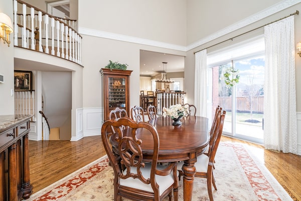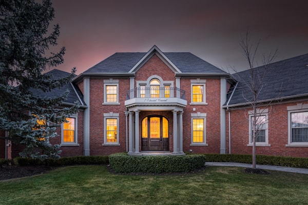 Inside, two formal entertaining areas and a two-storey dining space fan out around a winding staircase. All three rooms have fireplaces, crown mouldings and wainscotting. The eat-in kitchen has a large granite-topped island and high-end appliances. A U-shaped wet bar allows for casual drinks in the basement.