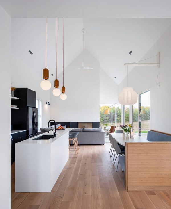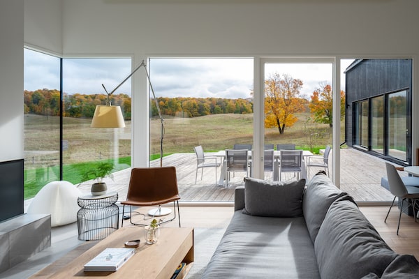 Recently completed by architect Wanda Ely for Dr. Mark Unger and Linda Friis Petersen, this holiday home in Mulmur, Ontario is an architectural balm of with crisp lines, creamy-white high ceilings, the yin and yang of black-and-white, precise millwork, rigorously planned moments, and the odd pop of colour.