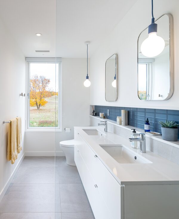 While the principle bedroom, the children’s bedrooms and the bathrooms are not huge, they all benefit from the same simple material palette, white walls, floating vanities, and a pop of colour via light fixtures or tile. In the principal bedroom’s en suite, royal blue tile extends from the sink right into the walk-in shower; because that tile is set into a niche, a special piece of machinery had to be employed to cut a bump-out into the shower’s glass wall.