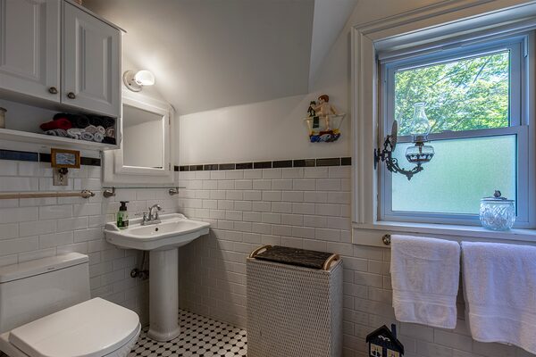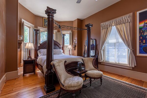 In the main house the ceilings are 12-feet high and there are four bedrooms. One wallpapered room has its own unique tin ceiling; a dark green painted room has tinwork as well and there’s a dark brown room with four-poster bed but, alas, no tin. Serving the guests is a large shared bathroom that was converted from the former sunroom to be a marble and tile showpiece with walk-in shower and a converted antique vanity.