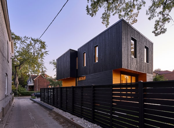 For Ms. Mazur and Mr. Aggus, Ms. Popovska created a similar atmosphere, this time almost entirely using wood and no concrete blocks. On first glance, the exterior is a bit forbidding, clad in a black-painted, engineered lumber siding called Maibec from Quebec. As guests approach, the main volume of the house cuts away around the front entry and the colour switches to a soft honey-tone (also Maibec), welcoming visitors to either go inside or linger on the deck. The stark contrast helps accentuate the warmer tones.