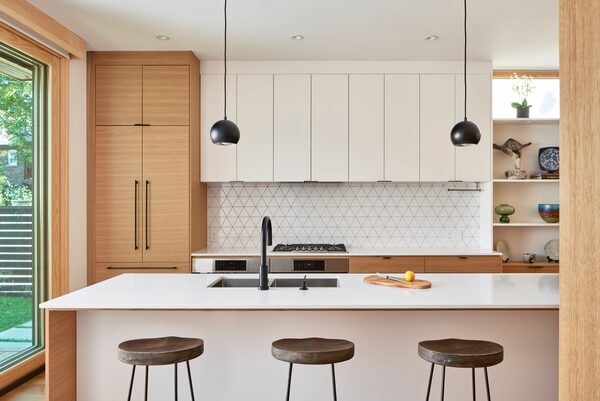 Blonde oak millwork, window casings and floors imbue a family-friendly coziness to the interiors.doublespace photography/Doublespace Photography