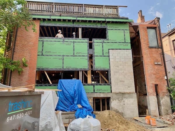 Crews work on the south-facing wall of the former residential duplex at 201-203 Gerrard St. E.Photos courtesy Agathom Co.