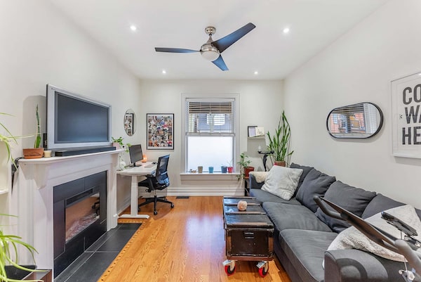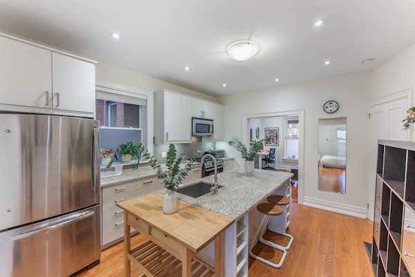 The ground level is set up as a one-bedroom unit with a bathroom, a kitchen with an island, and a living room with a gas fireplace. It also has access to a south-facing deck, and laundry facilities downstairs.