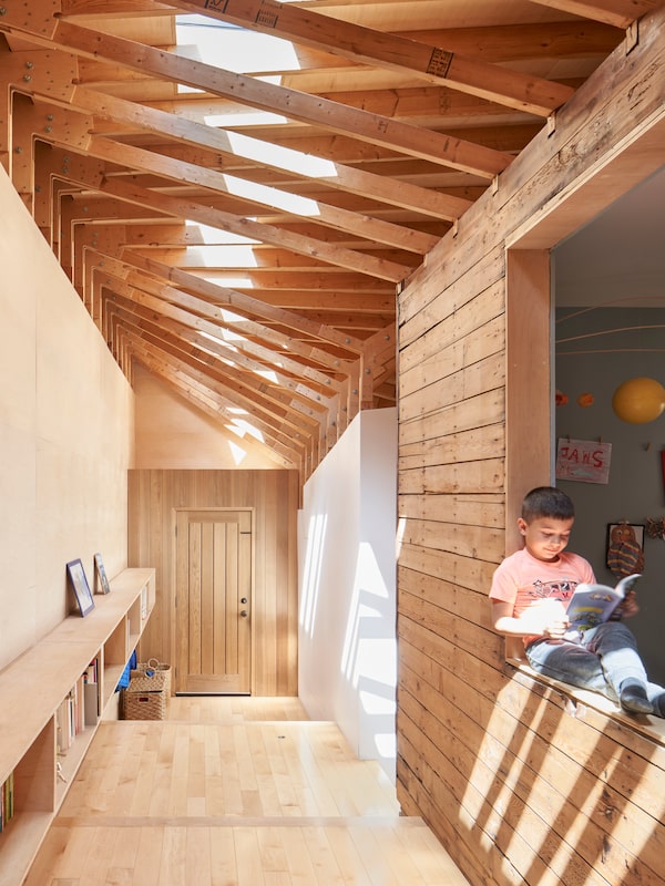 This corridor is indoors and yet outside the original house; it is a space in between. Up above, a row of L-shaped wooden brackets support an irregular roof that dips down toward the middle, then back up; Mr. Giaimo and his colleagues designed this complex geometry using digital design tools. And as Mr. Giaimo points out, there are at least four different species of wood in this area alone. There’s a lot going on.