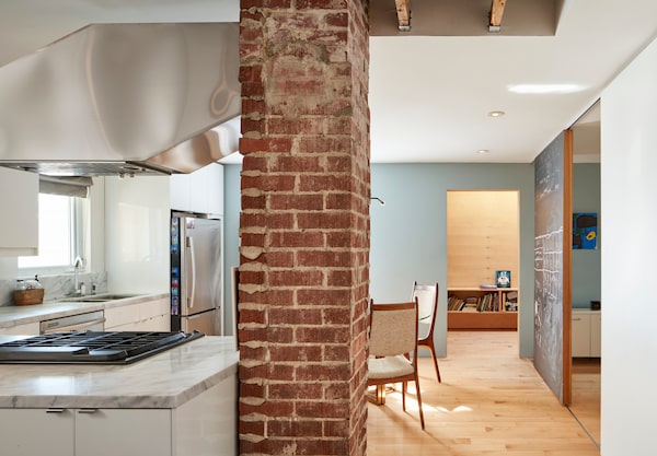 The kitchen has an exposed wire-brick chimney, brushing up against a new marble counter.Courtesy of Joey Giaimo/Courtesy of Joey Giaimo